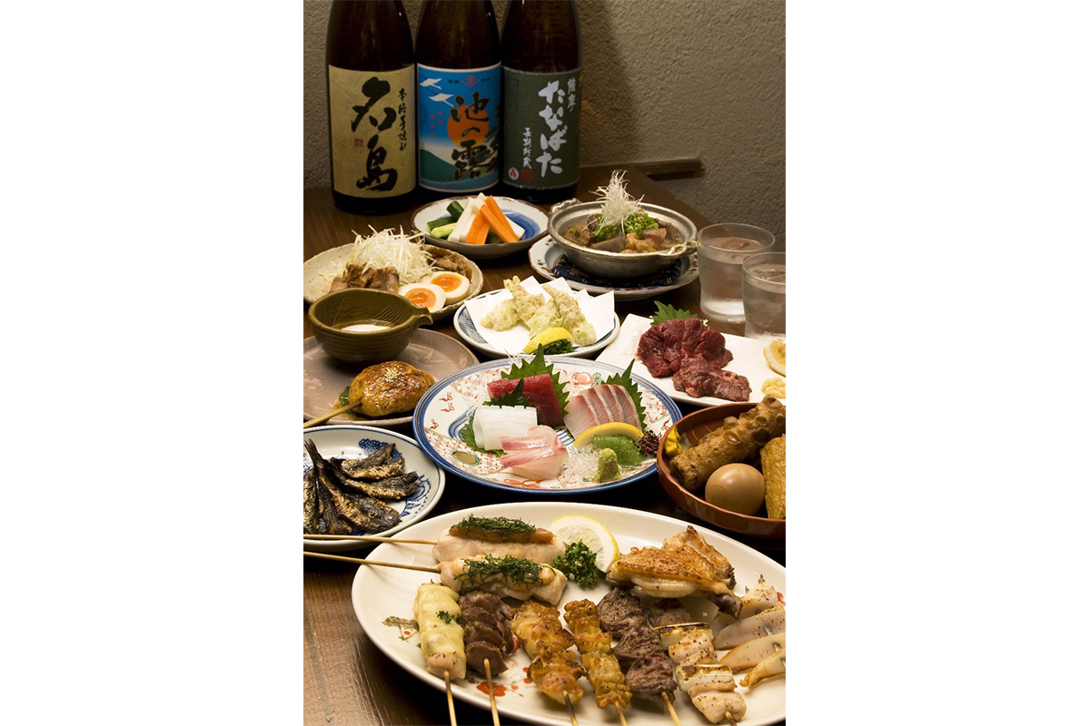 地元の地鶏「御殿鶏」を使用した焼き鳥や、季節ごとに変わる新鮮三島野菜の野菜巻き串と種類を豊富に揃えた焼酎や地酒と共にお楽しみください。
