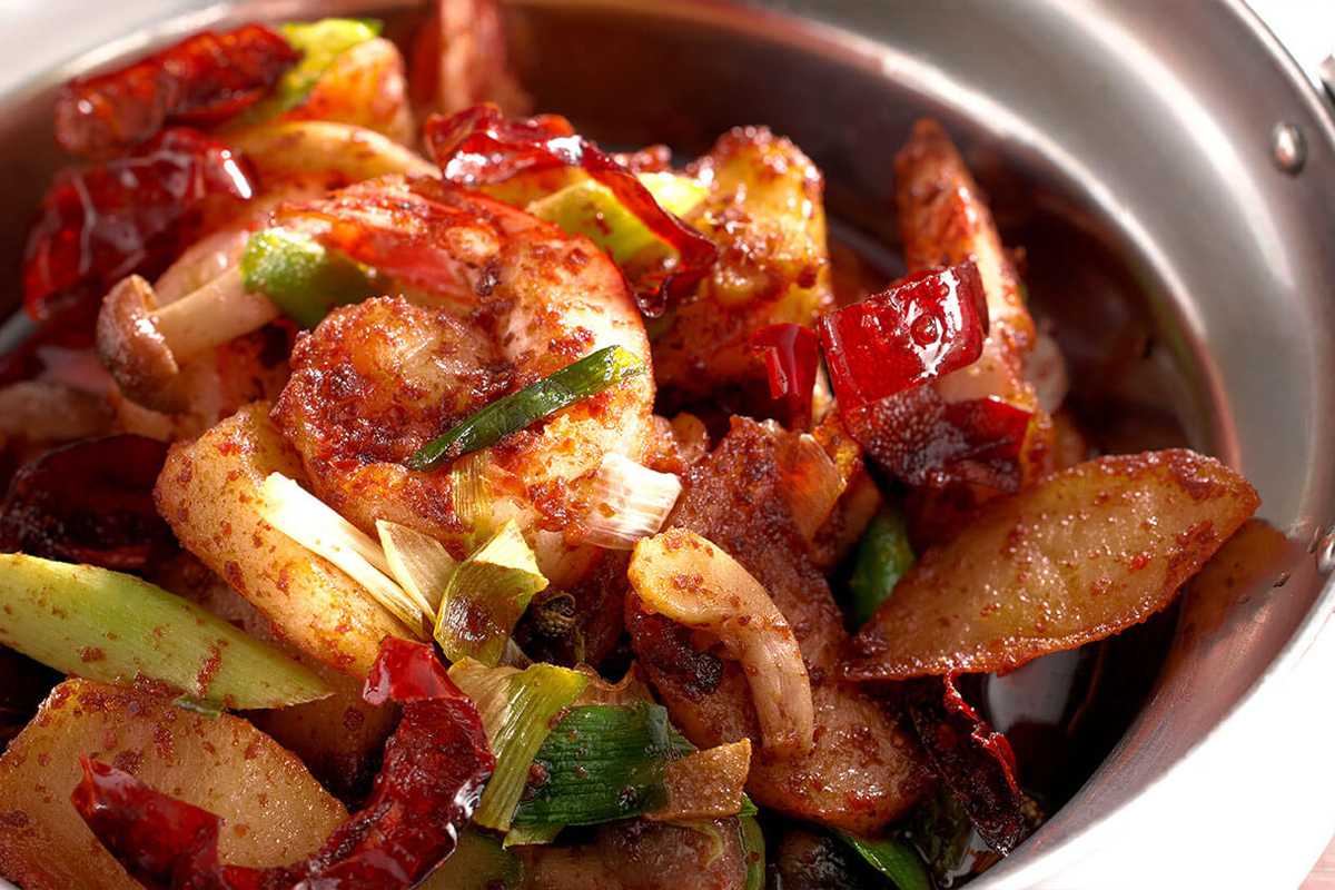 さらに、シェフおすすめの海老の干鍋(がんごう)は、スパイスの香りと刺激がクセになる“汁なし鍋料理”。